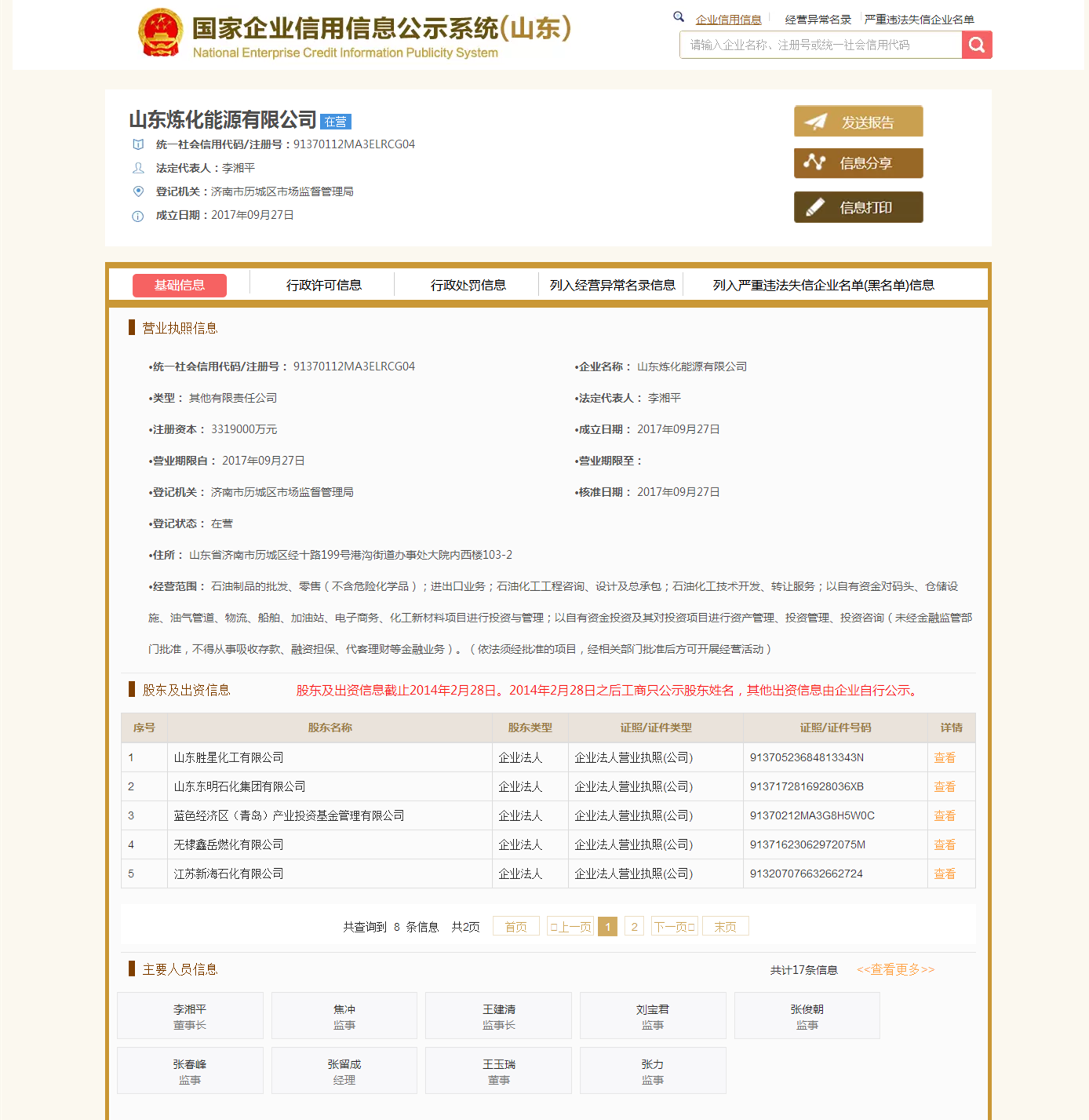 同时,凤凰网山东还注意到,自山东省炼油化工协会9月1日从山东省经信息委拿到《关于加快全省地炼企业转型发展组建山东炼化能源集团有限公司的复函》到完成工商注册,山东“大炼化”仅用了不到一月的时间。